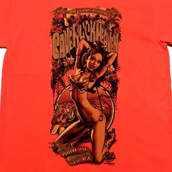 Rockin'Jelly Bean作品「CAVEROCK HEAVEN」のTシャツです。 ※ピグメント染めのTシャツです。洗濯の際に他の衣類と一緒に洗うと色移りする場合がございますのでご注意ください。 ※染めの工程により、寸法は個体差があります。最大1〜2cmの誤差がある場合がございますのでご了承ください。 ※実際の商品と画像では多少色味が違って見えますので予めご了承ください。 表記サイズ:実寸サイズ M:身幅55 着丈68 L:身幅58 着丈71(cm) お色:NEON ORANGE 素材:COTTON 100%