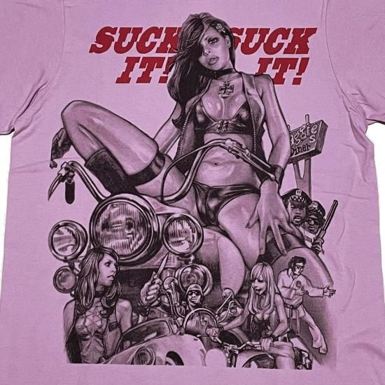 Rockin'Jelly Bean作品"PUSSYCAT ON MOTORCYCLE"のアートワークをオーバーサイズ気味にプリントしたTシャツです。 ※実際の商品と画像では多少色味が違って見えますので予めご了承ください。 ※サイズに個体差がある場合がございますので、若干の誤差はご容赦ください。 表記サイズ:実寸サイズ M:肩幅47 身幅52 着丈69 L:肩幅50 身幅55 着丈73(cm) お色:LIGHT PURPLE 素材:COTTON 100%