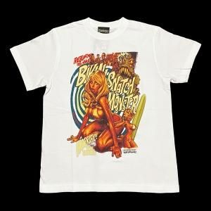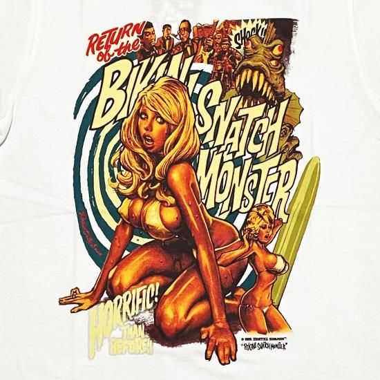 Rockin'Jelly Bean作品"RETURN OF BIKINI SNATCH MONSTER"のTshirtです。 ※実際の商品と画像では多少色味が違って見えますので予めご了承ください。 ※サイズに個体差がある場合がございますので、若干の誤差はご容赦ください。 表記サイズ:実寸サイズ S:肩幅40 身幅49 着丈65 M:肩幅46 身幅52 着丈69 L:肩幅51 身幅55 着丈73(cm) お色:WHITE 素材:綿100