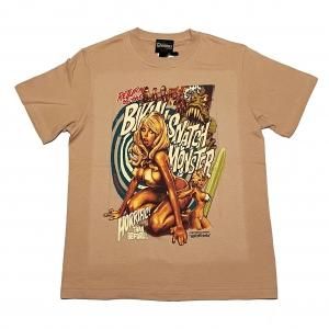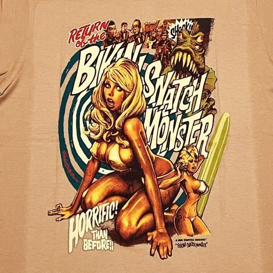 Rockin'Jelly Bean作品"RETURN OF BIKINI SNATCH MONSTER"のTshirtです。 ※実際の商品と画像では多少色味が違って見えますので予めご了承ください。 ※サイズに個体差がある場合がございますので、若干の誤差はご容赦ください。 表記サイズ:実寸サイズ S:肩幅40 身幅49 着丈65 M:肩幅46 身幅52 着丈69 L:肩幅51 身幅55 着丈73(cm) お色:CORAL BEIGE 素材:綿100