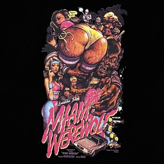 Rockin'Jelly Bean作品「MIAMI WEREWOLF」のTシャツです。 ※実際の商品と画像では多少色味が違って見えますので予めご了承ください。 表記サイズ:実寸サイズ M:肩幅46 身幅52 着丈69 L:肩幅49 身幅55 着丈73(cm) お色:BLACK 素材:COTTON 100%