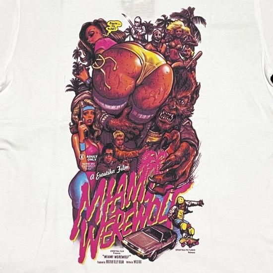 Rockin'Jelly Bean作品「MIAMI WEREWOLF」のTシャツです。 ※実際の商品と画像では多少色味が違って見えますので予めご了承ください。 表記サイズ:実寸サイズ M:肩幅46 身幅52 着丈69 L:肩幅49 身幅55 着丈73(cm) お色:WHITE 素材:COTTON 100%