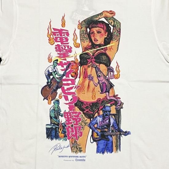EROSTIKA 19th Anniversary 電撃サイコビリー野郎 〜妖怪パンチ合戦〜 Monster Wrecking Mash 巷で人気のサイコビリーバンドPSYCLOCKSとBOBBY’S BAR!彼らは共に人気がありながらも地元では対立しているライバル同士。この2バンドが偶然遠方の同じライブハウスに出演する事になったからもう大変。いがみ合う2組の道中はさながらカーレース。激しいカーチェースは街中から山中へ。霧が立ち込める異様な雰囲気の中、カーブを曲がりきれず大クラッシュ! 気がつくとPSYCLOCKSとBOBBY’S BARは森の中へ投げ出されていた。 恐る恐る山中をかき分けて行った先に見つけたのは、おどろおどろしい墓場とそこで大宴会を繰り広げている妖怪たち。 サイコビリーVS妖怪たちの大宴会&大乱闘が始まる! ※実際の商品と画像では多少色味が違って見えますので予めご了承ください。 表記サイズ:実寸サイズ M:身幅52 着丈69 L:身幅55 着丈73(cm) お色:WHITE 素材:COTTON 100%