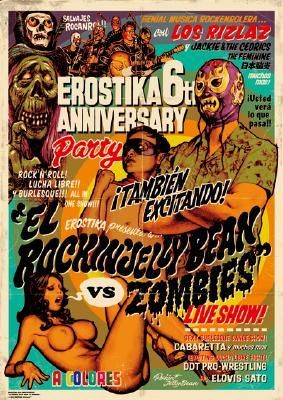 EROSTIKA 6周年記念"El Rockin'Jelly Bean vs Zombies"ポスターのレギュラーバージョンです。プリントはオフセット印刷になります。(El Rockin'Jelly Bean vs Zombies ポスターフレーム付きセットになります。) ※画像と実際のプリントでは色味が多少異なります。 POSTER SIZE:515 x 728mm FRAME COLOR:BLACK SIZE:515 x 728mm