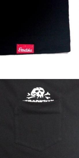 「VAMPIRE OF EROSTIKA」の第二弾、ポケットTシャツになります。 フロントにポケット+スカルのシルクプリント、バックのプリントはインクジェットになります。 ポケットの内側に隠れるようにEROSTIKAのロゴがプリントされています。 6.2OZ HEAVY WEIGHT BODY 使用。 ※実際の商品と画像では多少色味が違って見えますので予めご了承ください。 ※ポケットの縫製及び形状に若干の個体差がございますので予めご了承下さい。 表記サイズ:実寸サイズ S:肩幅42 身幅46 着丈66 M:肩幅44 身幅49 着丈70 L:肩幅46 身幅51 着丈72 XL:肩幅48 身幅54 着丈74 (cm) お色:BLACK 素材:綿100