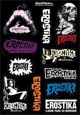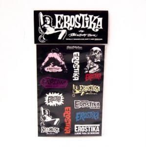 EROSTIKAの数々のロゴを使用したミニステッカーシートです。 白ベースと黒ベースの2種類ご用意いたしました。ステッカーの素材は塩ビ・PP貼り加工ですので屋外での使用も問題ありません。 ※実際の商品と画像では多少色味が違って見えますので予めご了承ください。 サイズ:105 x 150(mm) お色:BLACK 素材:塩ビ・PP張り