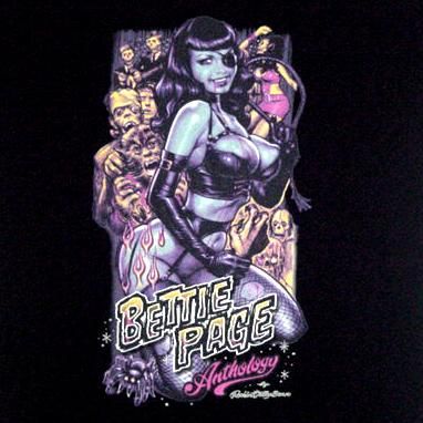 1950 年代に活躍し、今なお50s のアイコンとして知られる永遠のピンナップクイーンBETTIE PAGE をRockin'Jelly Bean が描くBettie Page Anthology シリーズより、"Zombie Hunter Page"をフルカラープリントしたT シャツです。 ※実際の商品と画像では多少色味が違って見えますので予めご了承ください。 表記サイズ:実寸サイズ S:肩幅43 身幅49 着丈65 M:肩幅47 身幅52 着丈69 L:肩幅50 身幅55 着丈73(cm) お色:BLACK 素材:COTTON 100%